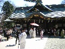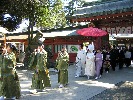 大国魂神社(東京都府中市)へ行ってきました。折りしも、神前結婚式が行われていました。おりしもって、実は知り合いの息子さんの結婚式(^_^;) 神社で行われる本物の神前結婚式なんか見たことがなかったので、見物に行っちゃったのでありました。笙の笛の穏やかな音色に錫杖がリズムを刻む厳かな式に、お宮参りなどで訪れていた参拝客も足を止めて、白無垢の花嫁を祝ってくれていました。こういう結婚式もいいねぇ。