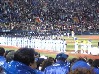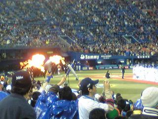 開幕セレモニーがド派手でした。テープが飛んできたり、人が飛んだり、地雷が爆発したり(笑)<花火だろう! ホーム側のスタメン選手が呼び出されたときは火の輪くぐりだし(うそうそ、ガスバーナーのようなもので、ボッと火がつくゲートをくぐってくるだけ)。