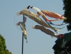 風が強かったので、鯉のぼりが本当に空を泳いでいるようでした。なまじの縁日よりすごい人出! お天気もよかったし、家族連れで賑わっていました。けっこう、迷子もでてたようです(笑)。おとながお店に夢中になっちゃうのかも。