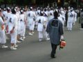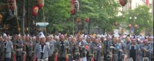 腹に響くような大きな太鼓の行列の後にいよいよ8基の神輿が御本殿から御旅所へ移る神事、くらやみ祭のメインとなる神輿行列が始まります。