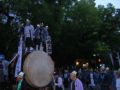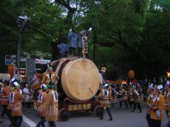 6時の時報で花火が打ち上げられ(音が聞こえただけだけど)、いよいよ先触れの太鼓「御先払太鼓」の行列がやってきます。一ノ宮、二ノ宮、あたりまでは薄暮で、まだ明るいのですが、だんだん暗くなって提灯に灯が燈りはじめる頃です。