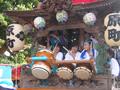 山車は1本の柱に人形などを固定し、高欄に乗った氏子の人々が太鼓を叩きながら賑やかにお囃子を演奏しています。これを引っ張るのですが、背が高いのでゆさゆさ、ゆらゆら、これがまた、いとおもしろしって感じ。