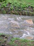 普段は飛び石をつたって対岸に飛び移れるようなところも、水量は少ないとはいえ、まだかなりの激しい流れになっています。岸の草木はなぎ倒されたあとはあるものの、もう復活の兆し。植物とはたくましいものですね。その速い流れの中で、ゴムボートで遊んでるおじさんがいて、びっくり。