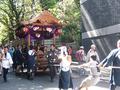 神輿は16日の渡御に備えて、各町内の御座所に鎮座しています。牛車は、その一つ一つを回り、神輿の前で宮司の祝詞?が唱えられることになっているようです。神輿の前の道には砂が敷かれていて、その上に鳳輦を停車させて、何やら儀式が行われるのですが、部外者には何が行われているのかは見当がつきません。みなさん、神妙に頭を下げて宮司さんの言葉を聴いていらっしゃるので「何してるんですか〜?」なんて、尋ねられませんでした(^_^;) ときどき、牛が「もぉ〜」なんて鳴くのが、なんとなくのどかでした。