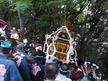 宮司の御霊移しの儀式が終わると、景気のいい祭太鼓の響きに送られて、神輿はこの石段を気勢を上げながら降りていきます。まずは一基。下に到着すると大きな拍手が沸きました。続いて「この御印籠が目に入らぬか」でお馴染みの葵の御紋の入った大きな神輿が続き、宮司らがその後に続きます。これも下に到着すると盛大な拍手。そして神輿は街へともみだして行きました。