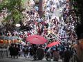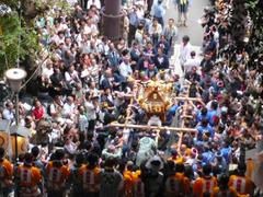 その石段を神輿が昇り降りするっていうんですから、すごいお祭です。見物人を押し戻す警備もしっかりやってましたし(かいくくぐったわけじゃありませんが、階段の一番上で写真を撮ってる私もいい根性でしょ?)、下で大型の救急車も待機していました。