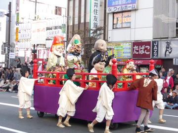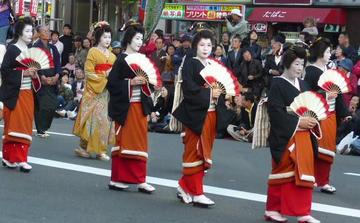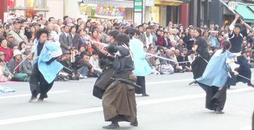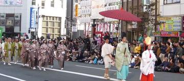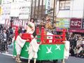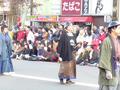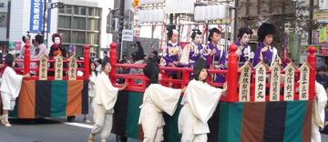 演じる人も堂々とした衣裳、化粧、鬘姿で、舞台顔負けの歴史絵巻です。といって、まあ、それだけのもんなんですけど(笑) ときどき立ち止まって繰り広げられる子どもたちの演技や、周辺の会社や商店の方々による踊りや素人芝居?もご愛嬌です。