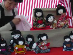 境内はものすごく混んでいて、後ろを歩いていた年配の男性が「正月みたいだなぁ」とおっしゃっておいででしたが、あま〜い! お正月はこんなもんじゃありませんね。一歩も前へ進めなかったりします。しかし、まあ、混んではいました。七五三が近いせいでしょうか、日本人形の露店も見つけました。かわいいお人形はやはり人目を引くようで、多くの人が立ち止まります。