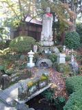 境内に入ると正面に本堂。東側の隅に鐘楼が建っていますが、これは新しく、最近になって建て直されたように見受けられます。本堂の左右にはピカピカの文殊菩薩と普賢菩薩の像もあります。墓地の入り口にたたずんでいる観音様と、その脇に植えられた見事に紅葉したドウダンツツジの赤が素晴らしいコントラストを見せていました。