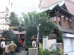 この日は神楽も奉納されるのですが、その時間にはちょっと間に合いませんでした。でも、舞は見られなくても演奏だけは聴けました。ビルとビルの間に挟まれたような予想以上に小さな神社でしたが、建物は尾州桧造の神社建築といって、中央区には現存するものが少なく、区の文化財になっているそうです。5〜6人も入れば社と鳥居の間の境内は満員という感じですが、次々とお参りに来てどぶろくをいただく人で賑わっていました。
