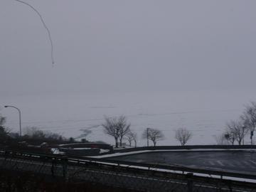 諏訪湖SAで、電話をかけるために停車。諏訪湖は積もった雪で真っ白でした。視界不良で全体は見えませんが、きっと凍っているんでしょう。今年は、神様がお渡りになれるでしょうか?