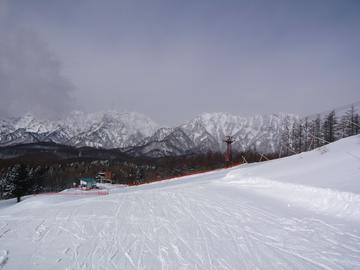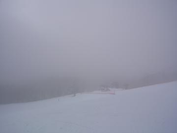 晴れていれば戸隠連峰がくっきり見えるのですが、あいにく上空に雲がかかっていました。そして、30分後、その雲が降りてきたらしく、ゲレンデ近くまでおぼろな霧に包まれ始めましたよ。あらら、視界不良だと子どもたちが危ないな……と思ったら、1時間後にはまた日差しが……。山の天気ってこんなですよね。↑と↓同じ場所から撮ってます。