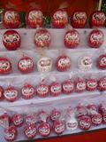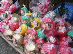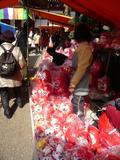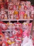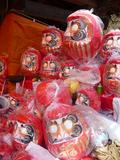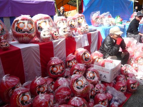 「だるま市」は、今年は平日になりました。人出は少ないのかと思ったのですが、そんなことはありません。大勢の人が訪れていました。でも、売れ行きのほうはいま一つな感じ。売れているのは小さめなものが多いようで、みなさん、お財布の紐は硬そう(笑) 赤いだるま以外にも色とりどりのだるまが並んでいました。おもしろいけど、「らしくない」って感じ。だるまマークの招き猫もあり、なんかご利益を欲張りすぎじゃないですか?(笑)