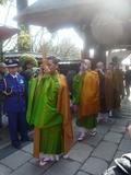 深大寺には百味講という江戸中期からの伝統ある儀式があるそうで、お練行列も行われると聞いて、その時間に合わせていってみました。鐘楼から響くゴーンという荘厳な鐘の音を合図にまずは笙を吹きながらの僧侶が露払い。そして、お清めの水をまきながらの僧侶が続き、纏のあとには地元の檀家連でしょうか、ご詠歌のようなものを歌いながら続きます。
