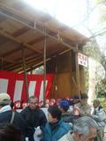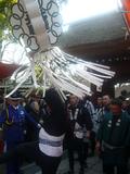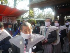 そして裃を着た方々が紅白の餅と梅の枝を飾った三宝をささげながらやってきます。しかし、スーツの上に裃って……。できれば和服にしてもらいたかったなぁ〜(^_^;)