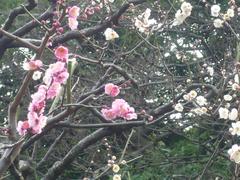 1本の木で、白い花をつけている枝とピンクの花をつけている枝のある梅を発見。挿し木でもしているのでしょうか。それともそういう品種なのかな? 私ははじめて見ました。