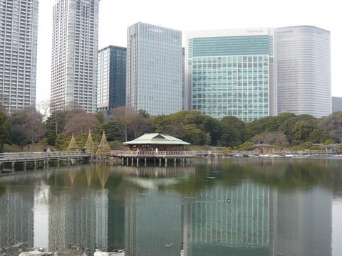 広々した日本庭園の大きな池に映っているのは高層ビル。なんとも都会的?な風景ともいえるかもしれません。いや、「都会のオアシス」を全面的にアピールしているというか(笑) 旧汐留貨物ターミナルが再開発され、近隣に高層ビル群が林立した結果、このような景観になったそうです。