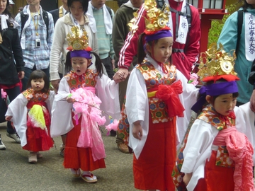 この天狗様に守られ、元気に成長するようにとの願いを込めて行われるのが稚児行列だそうです。事前に申し込めば、信徒さんではなくても参加できるとのこと。晴れ着に身につけた子どもたちのかなり長い行列がみられました。中には沿道の見物人ににっこり笑って手を振っていく、生まれながらのアイドル系のお子様も(笑)