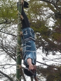終点の境内では、町火消しの梯子乗りが披露されます。ちょっと小雨が降っていて、滑って落ちはしないかとハラハラ。わざっと落ちそうにしてみせるドッキリもあって、僧主さんたちも立ち止まって楽しげに見物していらっしゃいました。
