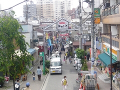 この「だんだん」を降りていくと、商店街。こちらも昔はどこででも見られたような風景でしょう、両側に商店が並ぶ狭い道です。ここにいろいろなところから観光客?がやってきて雰囲気を楽しんでいるんですね。美味しいと評判になっているらしい店の前にはコロッケを求める人の行列ができていました。「谷中銀座」という名称も昔っぽくていいです。