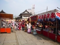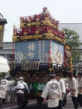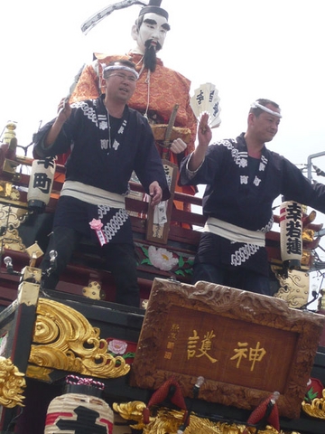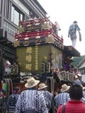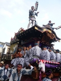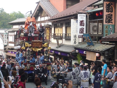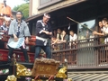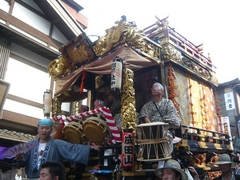 山車が練り歩く参道は、広くはありませんが、門前町という風情のある坂道。門前から駅へ向かっての上り坂でお囃子の人や音頭をとる人を乗せた重そうな山車を引っ張り上げるのはなかなか大変そうでした。2本の綱を大勢で引きますが、みんな汗びっしょり。逆コースを行くときは、前に綱が1本、後ろに1本が回ります。なんでかなぁと思ったら、ブレーキなんですね、後ろの綱は!