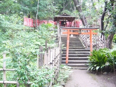 小さな社殿で、境内も広くはありませんが、入口の鳥居は立派。参道の突き当たりに階段があります。1633(寛永10)年に3代将軍家光が社殿を造ったときは、惣門が駿府城から移築され、鳥居が福岡藩主黒田忠之が寄進し、本殿のまわりには拝殿や唐門、立派な塀などがあったそうですが、1945(昭和20)年5月25日のほうの東京大空襲ですべて焼けてしまったのだとか。