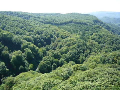八甲田山のロープウエイに行く途中で「城ノ倉大橋」を通りました。八甲田山麓の国道394号線にかかる橋で長さが約360メートルあります。橋の上は駐停車禁止になっているのですが、たまたま後部座席にいて、しかも交通量がほとんどないということで、最徐行、一瞬の停止を敢行してもらい、橋の中央でクルマから飛び降りました。いえ、橋から飛び降りて自殺しようとしたわけではありません。あまりにすごい景色なので……。