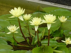 いま、温室から外の池に連れ出されているのは、「熱帯スイレン」だそうです。真夏だけは外でも生きていけるのでしょうが、今日は涼しいを通り越して上着が必要なくらいだったので、本来は熱帯で生きる睡蓮は震え上がっていたかもしれません。