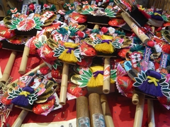 熊手は年々大きくしてゆくものとされています。毎年、熊手をお買い求めの方はすっごく大きな熊手になりそうです。大きな物もお店には飾られていましたが、どんな方がお買い求めになるんでしょうね。初心者には小さくて、お値段もお手ごろなもの。定価はついていないので、聞いてみないといくらかはわかりません。