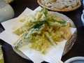 「うずら家」さんは店に入るとプーンとごま油の匂いが漂ってくる天ぷらも自慢のお店。釣られて「きのこ天ぷら」と「山菜天ぷら」を頼みました。たらの芽やこごみ……、「ああ、もう春なんだなぁ」という味わいです。まるごとのわさびを自分でするのもなかなか楽しかったです。味はもちろんですが、すりおろしているときのわさびの香りが食欲をそそります。