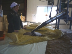 次の工程は、樽の中で十分発酵してどろどろになった大豆と小麦を搾るところ。特殊な布に樽から汲み上げた醤油のモトを広げ、何層にも重ねてプレスして醤油を搾り出します。外に「搾りカス」もありました。ちょっとちぎって食べさせてもらいましたが、ただしょっぱいだけ(笑) これは牛の飼料になるそうです。「牛が塩分を摂り過ぎになりませんか」なんてバカな質問をしたのですが、牛は塩をなめさせて育てるというくらいで、ものすごく塩分が必要な動物なので、ちょうどいい飼料になるのだそうです。なるほど。