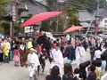 神輿の前後には、先頭の天狗様、白い馬に乗った中社の宮司様をはじめ、御神楽やお稚児さん、山車などが連なり、賑やかです。いつもご厄介になっている宿のご主人も神職なので、盛装で行列に参加しています。カメラを構え、「おとうさーん、こっち向いて〜!」って、やっぱり不謹慎(^_^;) 行列の先回りをして中社にお参りし、御神体が中に入るのを確認し、御神輿の車庫入れ(笑)まで、しっかり見物してきました。
