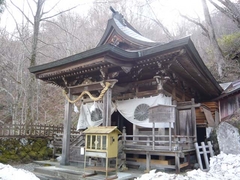 ここにはまだ雪が残っていました。どーりで肌寒いわけです。境内、といっても、本当に山肌を削ったようなスペースですが、ここにある滝の音も涼しさよりは寒さを感じます。真夏になると、汗びっしょりになって登ってきて、滝の音に清涼感を感じるということになりますが。