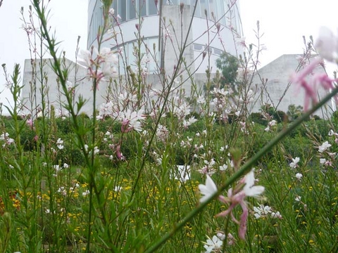 「わっ、白髪の花だ!」なんて、思ってしまったのは白ネム。垂れ下がっているのはもう花も終りというところで、白髪のまま、ぽそっと地面に落ちていたりします。なんだか身につまされるような……(^_^;) 個人的にはおしゃれな建物よりも美しい食器よりも、なんだかぼっさぼさという感じの大きなイチョウの木が気に入りました(笑)