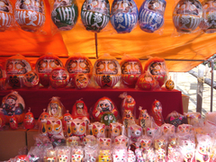 最近は赤ばかりではなく、さまざまな色のだるまが登場していますが、色ばかりではなく、「ヘンな顔〜!」というだるまも売られています。いや、だるまとは呼ばないでしょうね(笑) ご時世を反映してでしょうか、今年は招き猫の姿を多く見かけたような気がします。