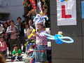 駅を離れて、メイン会場となっている通りへ。自動車を通行止めにして、道のあちこちに舞台が設けられています。ちょうどジャグリングが始まるときだったので、ちょっと足を止めてみました。やはり、いろいろ見たいと思ってしまうので、途中で失礼してしまいますね。申し訳ないようだけど。そして、次はパントマイムに立ち寄り、一輪車らしき芸にひっかかり……。
