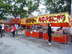 そんなこととは関係なく、「開港記念バザール」は、食べ物の屋台も、食品や雑貨も、全国からいろいろな種類のものが集まって、なかなか楽しい催しです。駅に近いほうにはハンバーガーや焼きそば、お好み焼、たこ焼きとおなじみの食べ物の屋台が並び、その先には八百屋さんや漬物屋さん、鍋釜を商っている店もありました。有名な刃物の里の包丁屋さんとか。切れ味のよさそうな包丁にちょっと心ひかれたのですが、電車に乗って持って帰ったら、捕まっちゃったりしないのでしょうか?(笑)