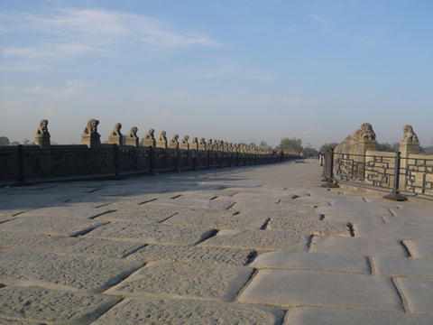 マルコポーロが「東方見聞録」の中で、この橋を「世界中どこを探しても匹敵するものがないほどの見事さ」と記したことから、西欧ではこの橋のことを「マルコポーロの橋」と呼ばれているそうです。橋のたもとには乾隆帝の筆と伝えられる「盧溝暁月」の石碑があります。この皇帝がここで月を見たということ、現在でも月見の名所になっているのだとか。
