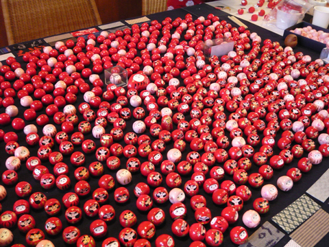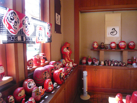 だるまは、まず木型を取って、それにあわせて作っていくというのが主流らしく、ギャラリーの内外に「だるまの素」ともいえる木型がいくつか展示されています。木型はだるま職人の命だそうで、「木型を他人に渡すときは廃業するとき」といわれているとか。もちろん「顔も命」なのでしょうが、その前段階にも魂が込められているということになりますね。