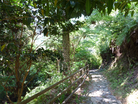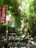 「つぼ湯」の少し下の川岸に「湯筒」という源泉が噴出しているところがあります。かなり熱いのでうかつに触らないように囲いがしてありますが、ここで温泉玉子や茹で野菜を作ることができるそうな。近所の店で卵や野菜を売っています。玉子なら15分ほどで茹で上がるということなので、温泉に玉子をしかけ、温泉街の上にのびる熊野古道を散策するというのが一般的な楽しみ方? 熊野古道は全部あわせると700キロにも及ぶといいますが、ここらあたりは山の中の小道が続いているという感じで、なるほど「古道」の雰囲気が味わえます。