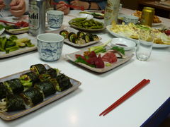 スキー関係の大先輩方が主催する「蕎麦打ち飲み会」。日頃はタテの物をヨコにもしない(と、思われる?)オジサマ方が、額に汗して蕎麦を打ち、ふるまってくださるという手作りの宴会です。私のような若輩者がお招きいただいたのは2回目ですが、この会は、もうずいぶん長く続けられているそうで、蕎麦打ちの腕は玄人が裸足で逃げ出すというほどのものです。木島平産の新鮮な蕎麦粉で、今回はざる蕎麦のほかに蕎麦巻きも作ってくれました。