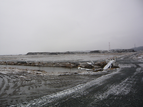 その地図上の1点に私たちはいるわけですが、その1点から見る風景は、限りなく何もない……。瓦礫を処理しているショベルカーは数えてみたら1ヵ所に20機が働いていました。その1台、1台がまるでアリンコのように見えるほど、何もない地面が広がっています。復旧、復興の速度が遅いという苛立ちの声をよく耳にしますが、この広さじゃ、そう一朝一夕には……と思わされます。地図上の1点でこれだけの「何もない」地面が広がっているのに、地図にはべったりと広範囲に色がついているのですから。もっと北のほうをみれば、岩手県に向って海岸線は広く色付きです。