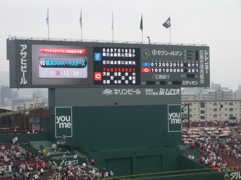 しかしながら、土曜日の昼間のゲームともなれば、雨模様が約束されていたにもかかわらず、多くの人々がスタジアムに集まってきます。私たちが泊まっていたホテルは、スタジアムから徒歩7、8分というところ。私たち以外にもベイスターズファンの宿泊客を数人見かけましたが、赤いユニのカープファンがたくさん泊まっているのでちょっと驚きました。週末ということもあって、日帰りできない地域のカープファンもいっぱい駆けつけてきているのです。広島県も広いですし、四国にもカープファンがいっぱいいますしねぇ。エレベーターで出会ったのは、熊本から来た人と名古屋から来た人でしたけど(笑)