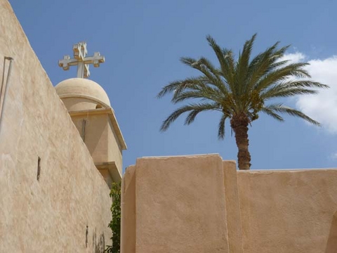 アレキサンドリアからカイロへ帰る途中に、コプト教の修道院がいくつかあります。メインストリート砂漠の道から、さらに砂漠の奥へと進まなければならないので、一般的に観光で行く人は少なく、ベテラン添乗員のゴーちゃんでさえ、行ったことがないという場所でした。エジプトはイスラームの国というイメージがありますから、キリスト教の遺跡を訪ねるという視点がないといえば、ないような気もします。たまたま日本語ガイドのミーナさんが貴重な13%(笑)だったこともあり、ここに立ち寄ってもらうことを思いつきました。