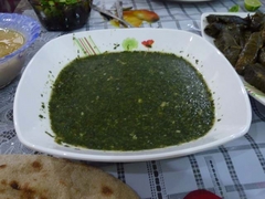 私がそれを好きだと言ったために特別に作ってくれた「スズメの舌のスープ」。スズメの舌が入っているわけではなく、米粒大のパスタがスズメの舌のように見えるというあっさりしたチキンスープです。アラビア語で何というのか……、何度聞いても覚えられません(-_-;; すごくおいしかったのは、モロヘイヤのスープ。モロヘイヤを細かく刻んでネバネバを出し、みじん切りのニンニクを色が変わるまで炒めたものにチキンスープを加えて、その中にモロヘイヤを入れて混ぜたものだそうです。ネバネバですが、意外とさっぱりしていて、ナンですくって食べるととても合います。