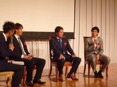 昨年は、確か6人の選手が参加したのではなかったかと思いますが、飲食+選手インタビュー+サイン・撮影会のような感じでした。今年は頭角を現し始めた若手を交えて9人の選手が参加し、3人ずつのトークショーと抽選で私物のプレゼントが行われました。その分、サイン・撮影などをする時間が極端に少なく、途中で時間切れ打ち切りなったりして。普段は分別くさい顔をしている大のオトナが嬉々として行列に並んだりするわけですから、この時間が短いというのは不満のもとになりそうです(笑) 3人がトークしている間に他の人はサインに応じるとか、なんとかやりようがあるだろうに……と、あちこちから呟きが聞こえていました。最近、ファンとしての気合はまったく感じられない私はいいとして、色紙をいっぱい買ってやってきた長老たちは、ちょっとさびしそうでした。