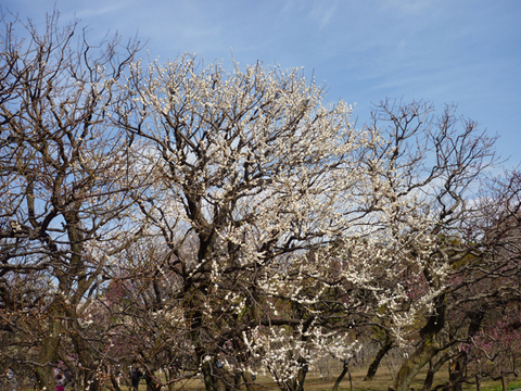 今年は、梅の開花は遅くなっているのですよね? 植物園の入り口には「梅まつり3月2日まで」と書いてありましたが、梅林は5〜6分咲きといったところ。まだ蕾だけの木もたくさんありました。それでも馥郁とした梅の香が漂っています。このあたりには杉もないようで、花粉症の人もマスクをはずして、梅の香を楽しんでいる様子です。梅の花は桜に比べれば、やや地味な感じもしますが、香りだけは梅の勝ちですね。香りまつたけ、味しめじ的な? ちょっと違うか(笑)