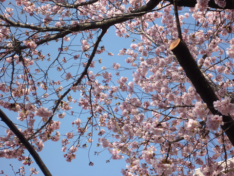 梅に気をとられているうちに、桜にもそろそろ順番が回ってくるという気候になりました。今日は、暖かかったですねぇ。ちょろちょろと歩き回ったら、汗をかいてしまいました。もちろん、コートを着ていたわけでもありません。ちょろちょろの第一歩目で寒避桜の満開に出会いました。そういえば、この桜はこのあたりで一番開花が早いというので、見物人を集める桜だったのでした。今日も数人がカメラを構えていました。空に抜いて写真を撮ると、きれいに桜だけが写りますが、実は背景にはマンションがあります。だから、全体像を撮影するとあまり風情がないんですよね(笑) カメラ片手に集まって来る方々も、空に抜いたり、アップを狙ったり……建物が写らないようにいろいろと工夫をしています。夢中になって、通り過ぎるクルマに思い切りクラクションをならされたり(-_-;; そんなにクルマの通る道でもないのですが、撮影ポイントは道の真ん中だったりします(笑) この桜が花びらを落とし始める頃、ソメイヨシノがいっせいに花をつけることになります。来週なのか、再来週なのか……。