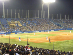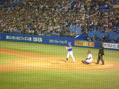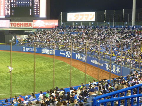 交換してもらったチケットは、1塁側。こちらは、さすがに満員に近いほどの観客が入っていました。こっちの角度から見るのははじめてだったので、しばらくはスワローズファンの間に入って、けっこう楽しく観戦していたのですが、途中からこっそり3塁側に引っ越しました。本当はいけないのですが、だって、空いてるんだもん(笑) 応援のためというより、隣の席は空いているものという環境で見慣れているため、混んでいる席からは逃げる傾向にあるのですよ、私たち(^_^;; どのみち、1回の裏で勝負はついた感じで、今年もベイスターズは裏街道を行くことを予感させるスタートとなりました(-_-;;