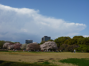 東御苑といわれるところは、旧江戸城の本丸跡。ここらへん一帯、誰も住んでいなかったら世界遺産候補という感じですが、なにせ住んでる人が住んでる人なので、江戸城の全貌は一般人が見聞することは不可能です。東御苑と呼ばれるあたりだけは通り抜けができるので、都会のオアシスという感じです。しかし、何万という人がこのあたりに集結していたので、周辺も人、人、人。千鳥ヶ淵に抜けたのですが、地理に暗いふたり連れは、メインの桜並木を上手にはずし、よくわからないまま土手を歩いて九段下に抜けました。お天気がよくて気持ちがよかったのですが、歩きつかれてお茶を飲んでる間に、一転にわかに掻き曇り……という状態だったらしく、外の見えないカフェから出てきたら、雨が降り、風もビュービュー。予報は知っていましたが、あまりの急変ぶりに驚かされました。